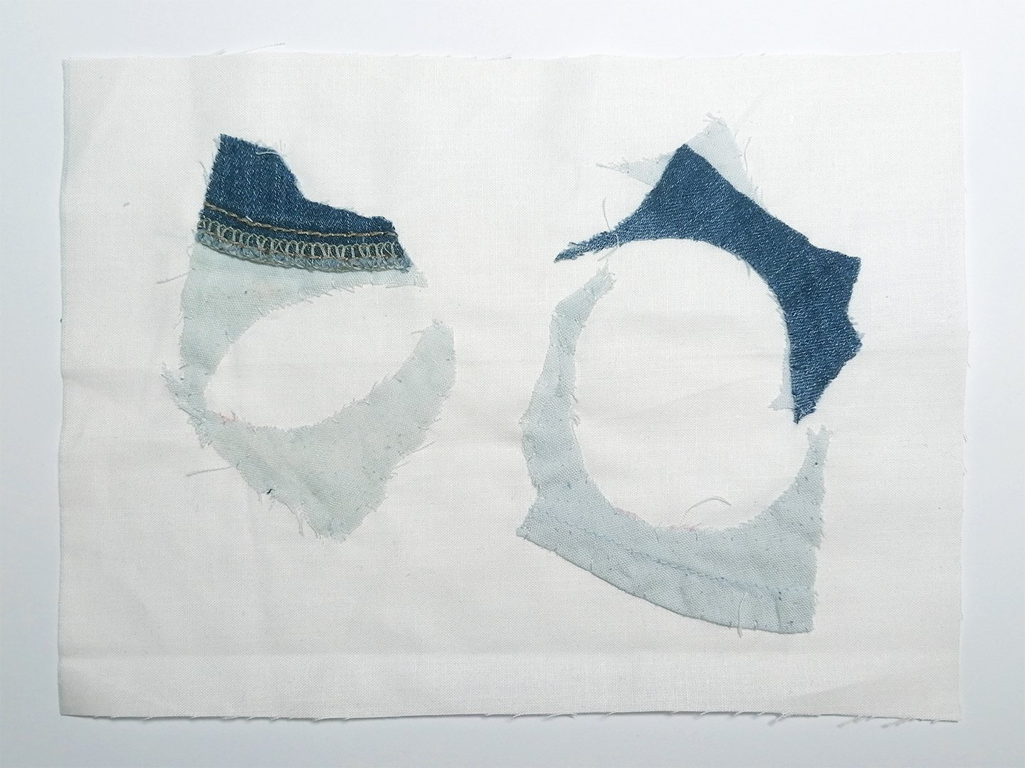 Fleur Leclère, Recherche applications flottantes-1, 2025, broderie, toile de coton, pantalon et doublure de blue jean, 16x22 cm