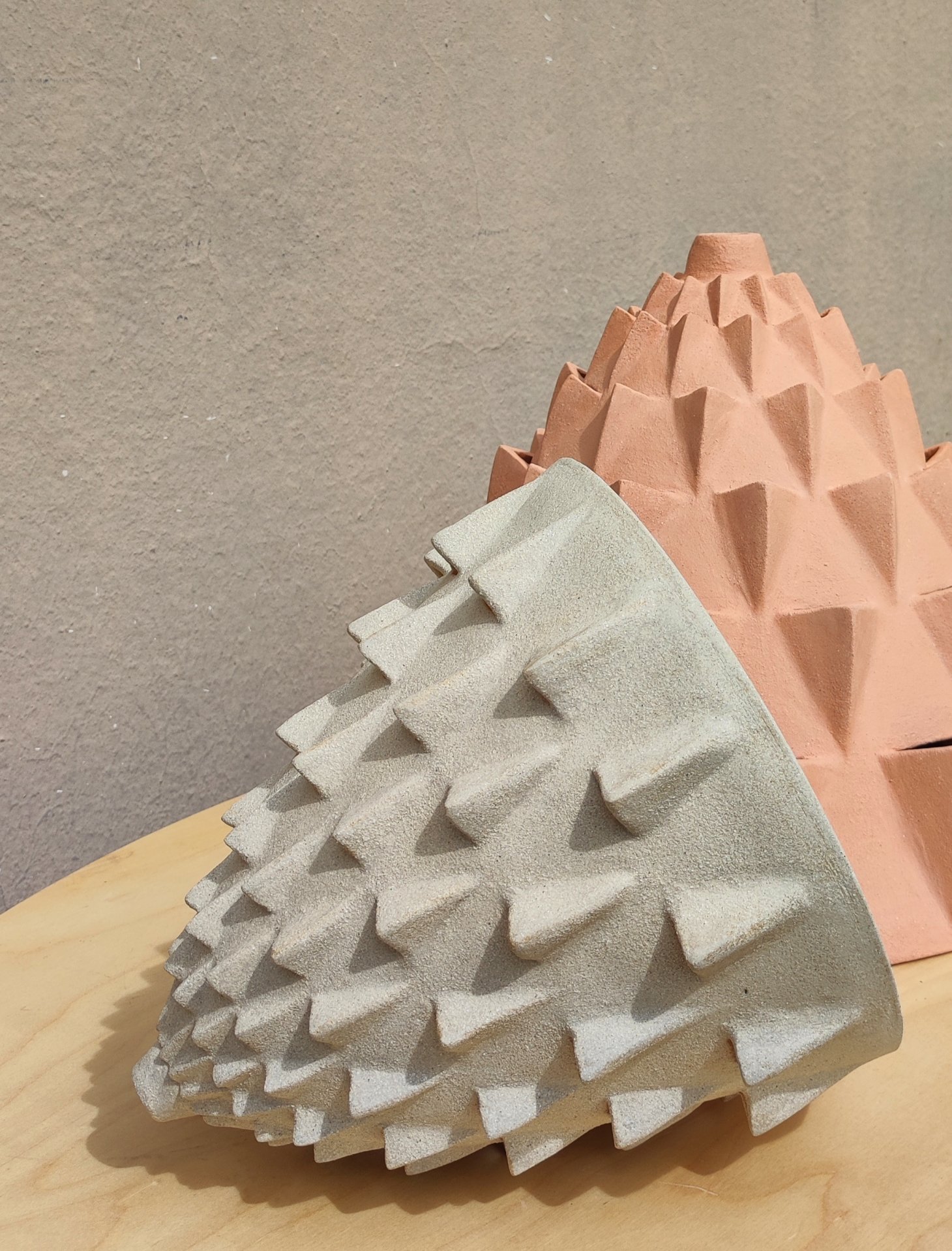 Nathalie Chauvin, TOLEK #1 (gauche) et #2 (droite), grès blanc chamotée et engobe orange, diam. 24,5 x h. 24cm ; grès brun chamotté, diam. 39 x h. 32,5cm, 2024.