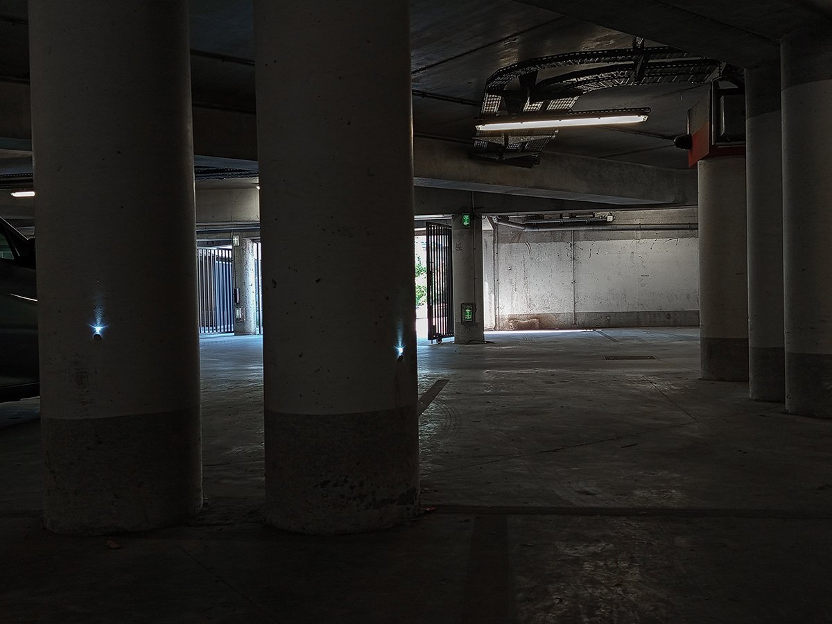 Salomé Coste-Blochet, BALISE, 2025, installation lumineuse in situ, parking souterrain de Sotteville-lès-Rouen, (led bleue, blanche et jaune, pile 3V) dimensions variables