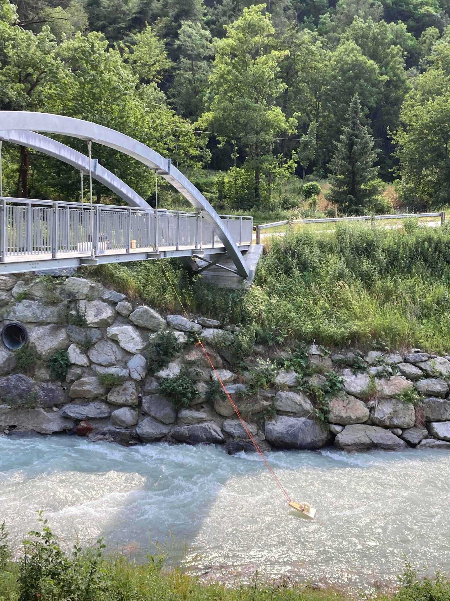 Salomé Coste-Blochet, CONVERGENCE DES FLUX , 2023, installation in situ, Chippis, Suisse (roue à aubes, dynamos, haut parleur) dimensions variables