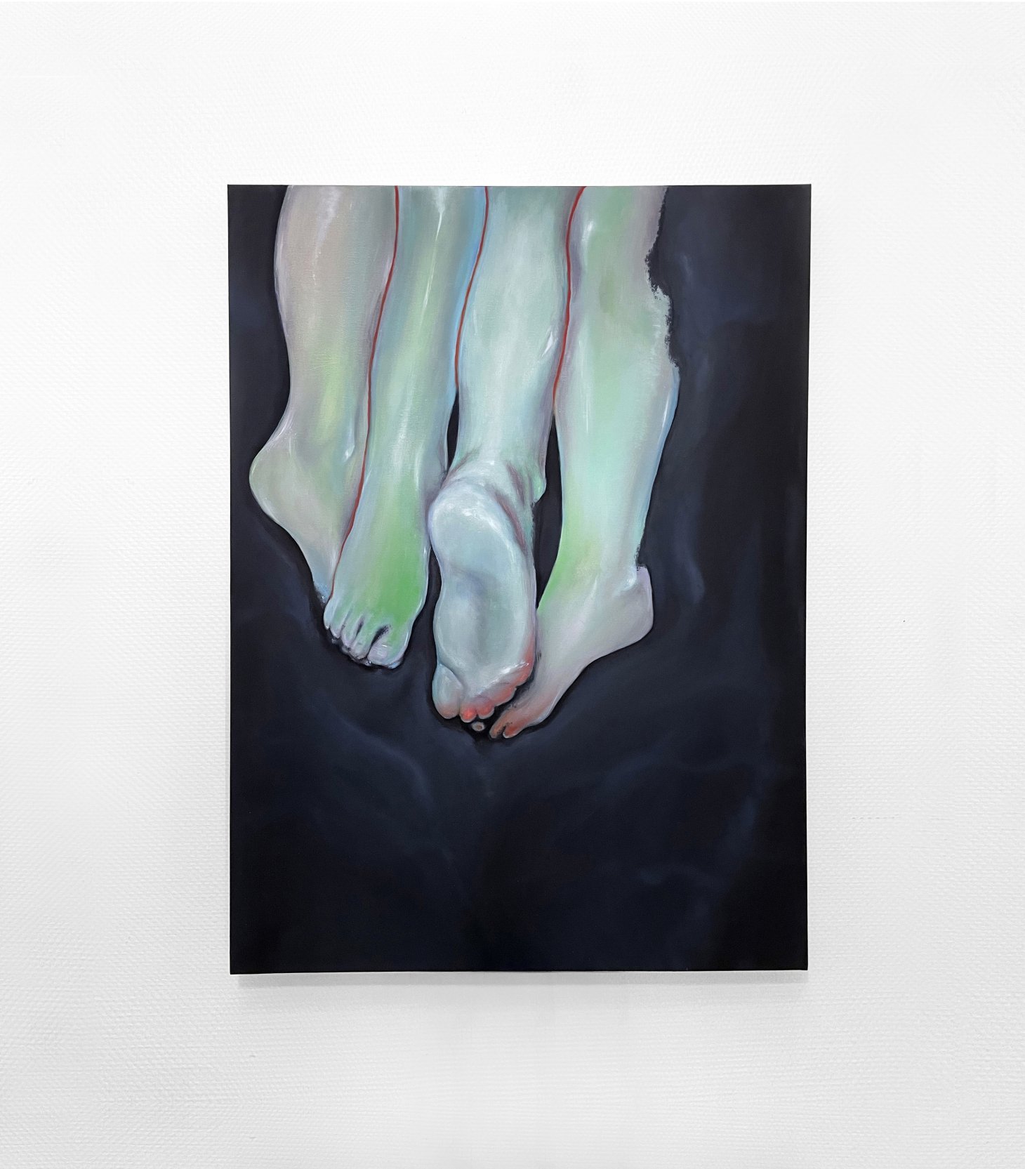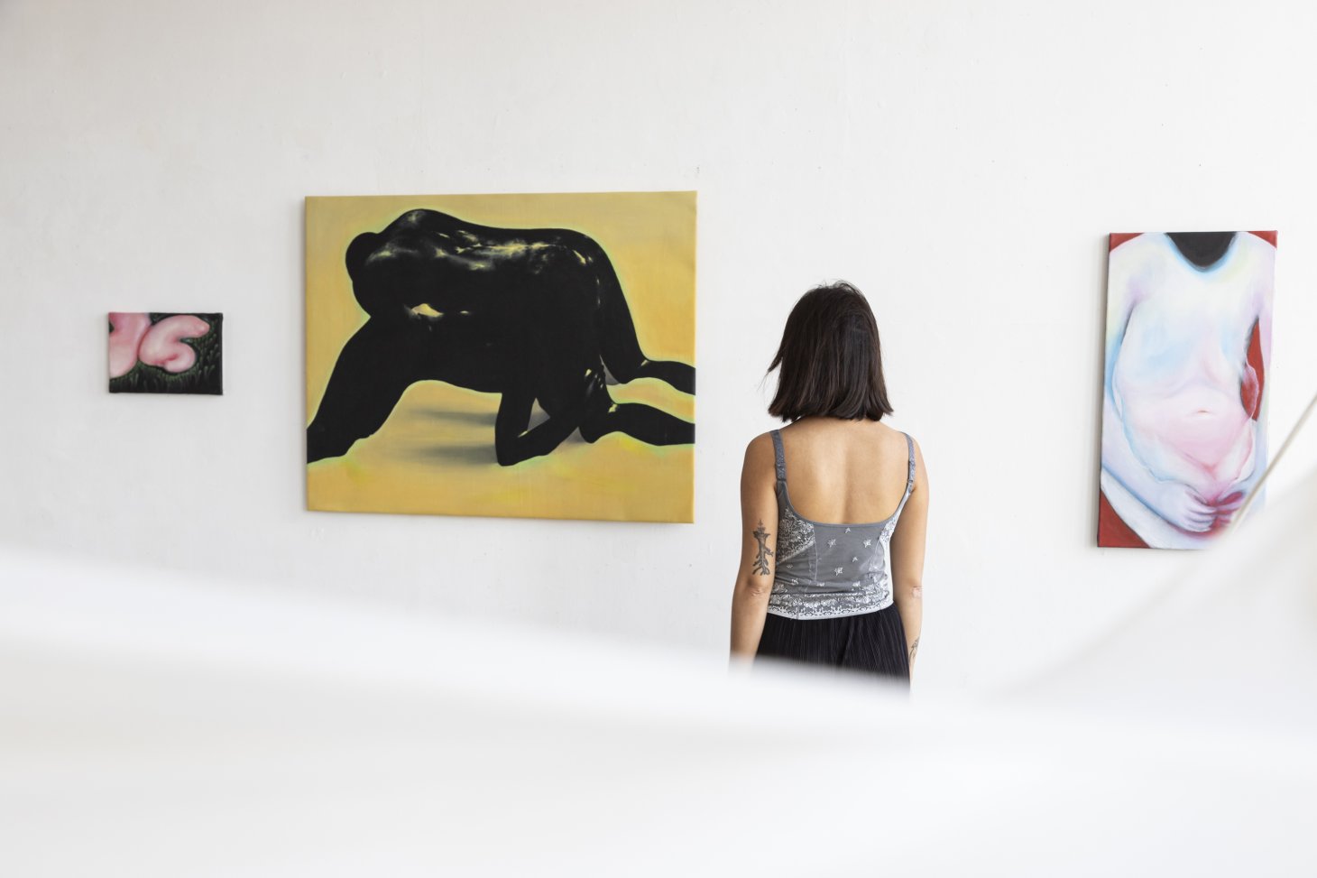 Shuyin Hou, (de gauche à droite) SANS-TITRE, 24x37,5cm, *I WANT TO EXPERIENCE THE SPACE-TIME WARPED BY YOU*, 90,5x116cm, 痂*, 40x80cm, acrylique sur toile, 2024. Photo : Atelier photo ésam, 2024